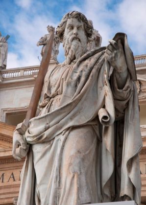Escultura de Pablo de Tarso, en la entrada de la Basílica Extramuros de San Pablo. Roma.