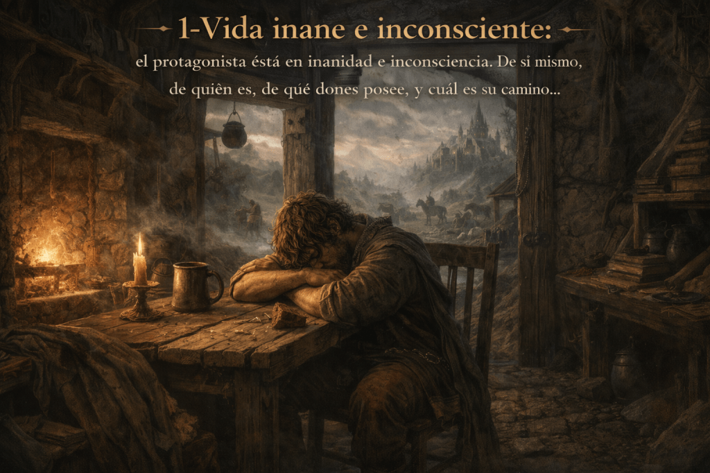 1. Vida Inane. El protagonista lleva una vida sin propósito, mecánica, desconocedora de su propia fuerza y de sus propios dones.