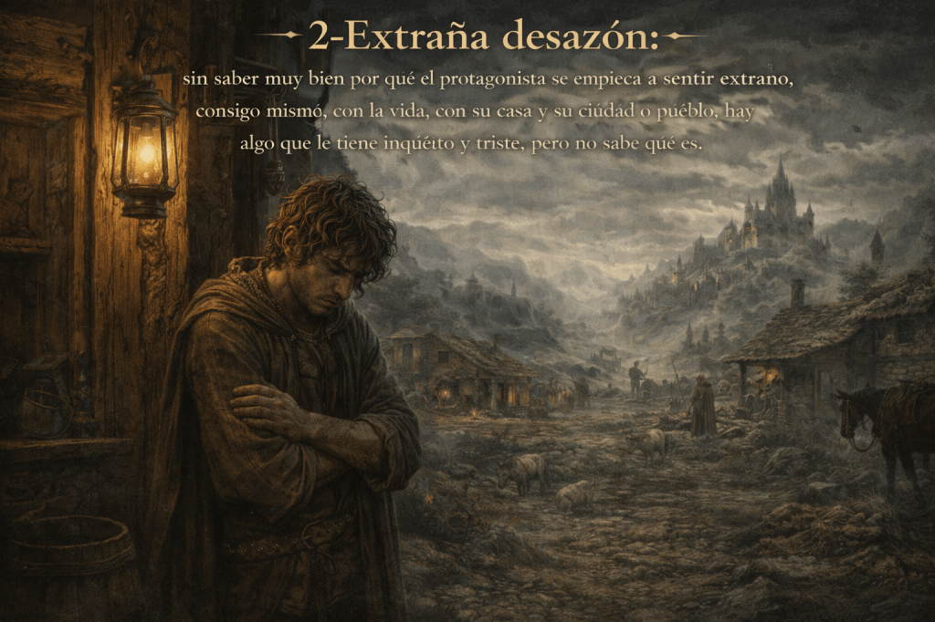 2. Extraña Desazón. El protagonista descubre que no es feliz, que su vida está incompleta, que la inanidad le está comiendo por dentro. Intuye que está desperdiciando su vida. Esto le vuelve sensible a la llamada del destino.