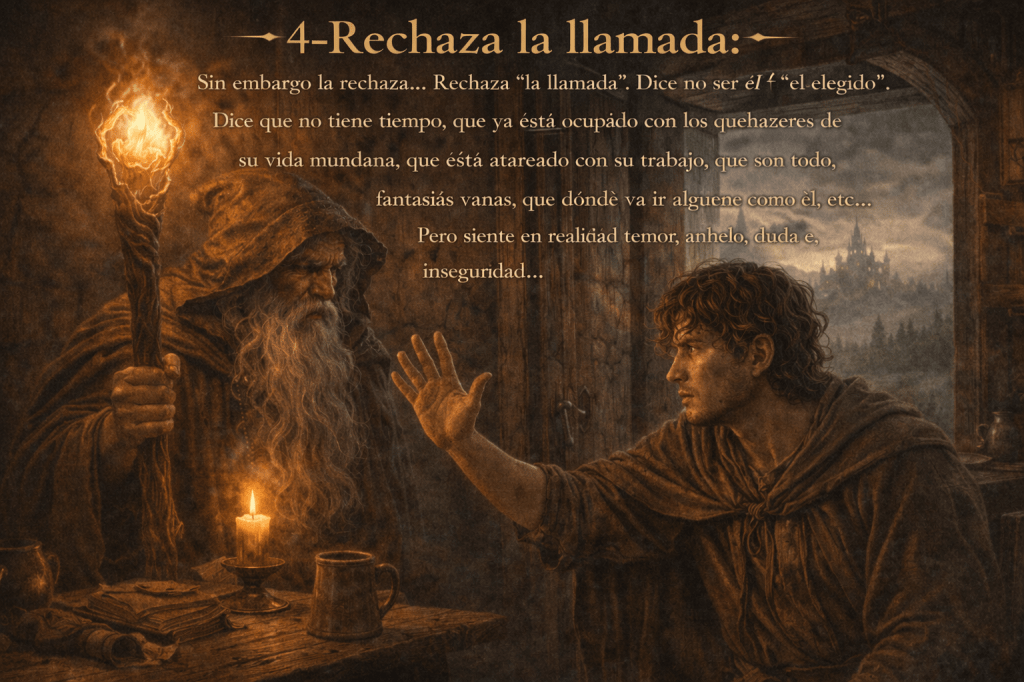 4. Rechazo de la llamada. El protagonista rechaza en un primer movimiento esa llamada por acomodamiento, miedo o inseguridad.