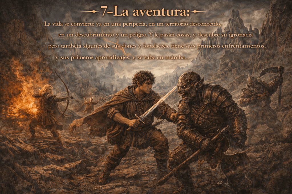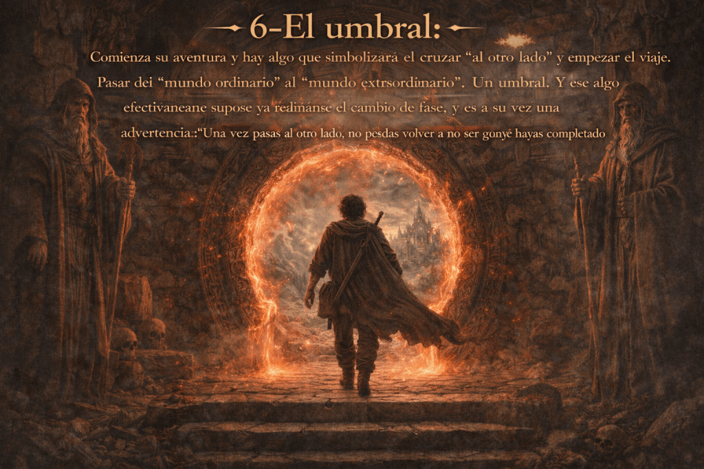 6. El Umbral. Un río, un puente o un guardián le dice al protagonista que, tras cruzar ese paso ya no podrá volver sin haber cumplido su misión.