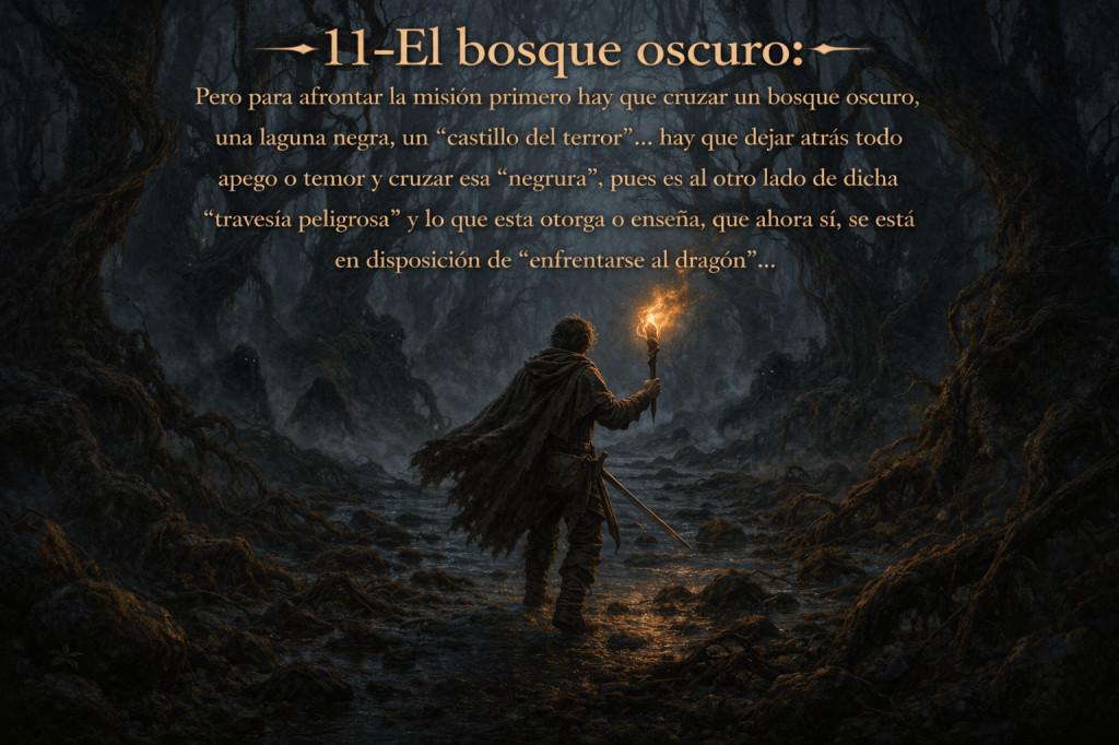 11. El Bosque Oscuro. Para seguir avanzando debemos enfrentarnos a aquello que llevamos dentro y que nos sabotea. Traumas, apegos, miedos inconscientes, deben ser derrotados. Para llegar a la Cueva del dragón, hay que romper esas cadenas.