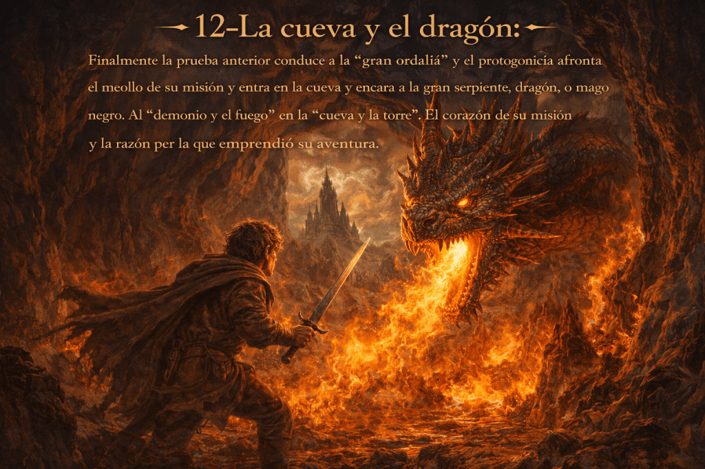 12. La Cueva y el Dragón. Has roto todas las ataduras y estás en condiciones de convertirte en el héroe que puede derrotar aquello que potencialmente tenías el poder de derrotar. Es la Gran Ordalía: enfrentarte al destino final de tu aventura.