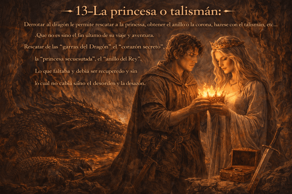 13. La Princesa o el Talismán. Cuando matas al dragón consigues algo: un talismán, un cetro, rescatar a una princesa… algo que te permite reequilibrar el orden del mundo.