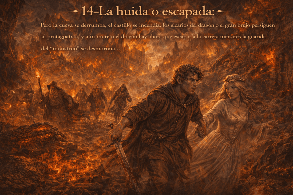 13. Huida mágica: El retorno puede ser peligroso; a veces el héroe debe escapar con el elixir.