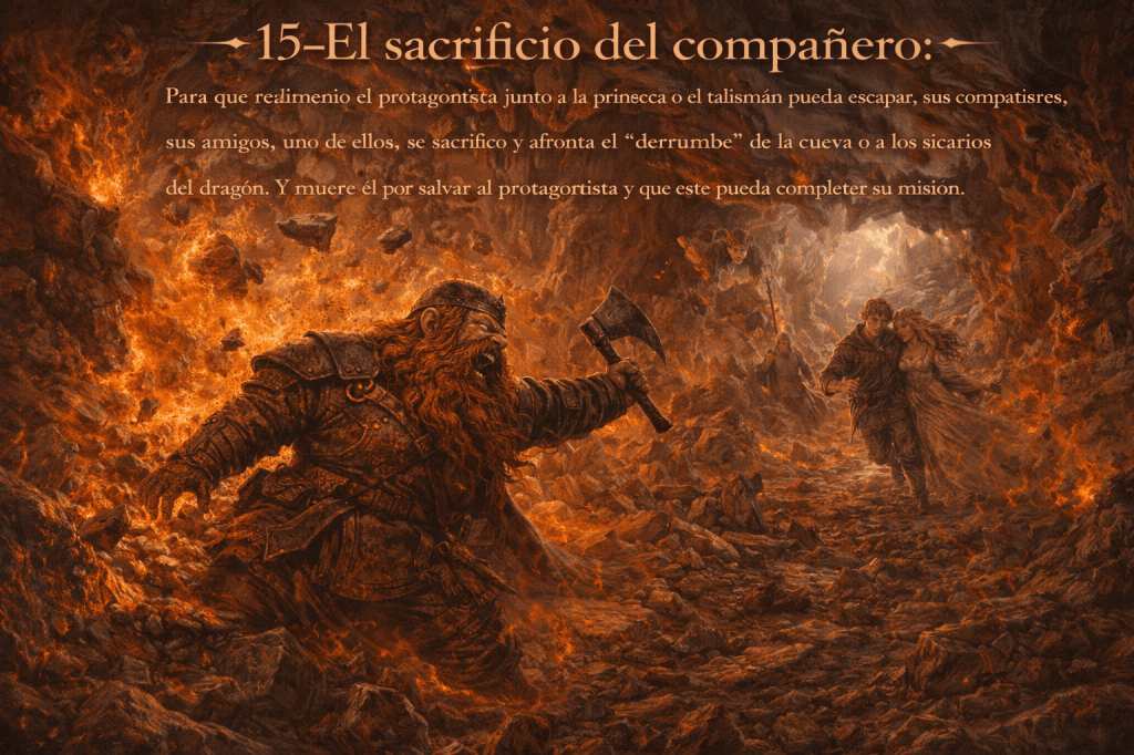 15. El Sacrificio del Compañero. Para que el protagonista pueda lograr escapar, uno de sus compañeros se sacrifica, para que éste logre terminar su misión. Alguien ha confiado tanto en tu misión que no le importa sacrificarse. Es el Héroe Oscuro, alguien que quizás fracasó en su propio camino del héroe o se quedó a mitad de camino, y sigue teniendo una cuenta pendiente con su destino. A veces es un proto villano, es una persona de ética dudosa o está maldito. Él fracasó, pero se redime sacrificándose.