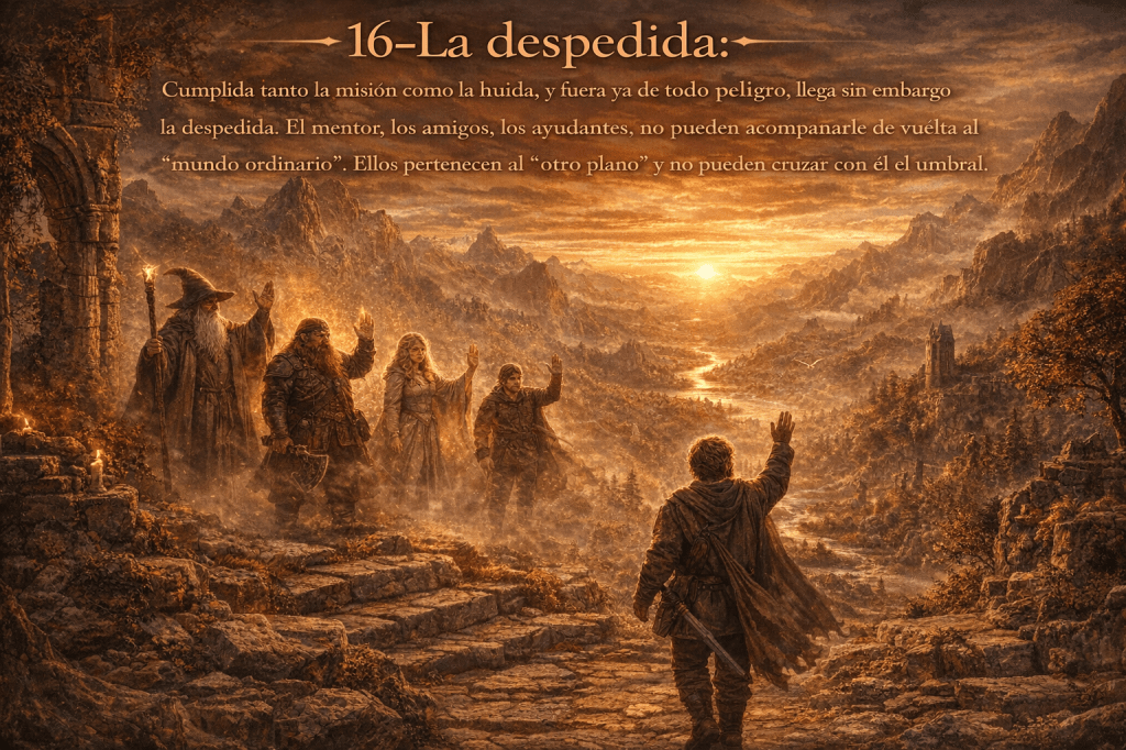 16. La Despedida. El mentor y los compañeros no pueden acompañar al protagonista hasta su propia vida cotidiana y éste se despide de ellos. A veces no los volverá a ver nunca más. El protagonista inició el viaje solo y debe volver solo. Ellos posiblemente deben recorrer sus propios caminos.