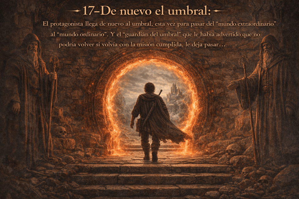 15. Cruce del umbral de retorno: Reingreso al mundo ordinario, llevando consigo el conocimiento o el don adquirido.