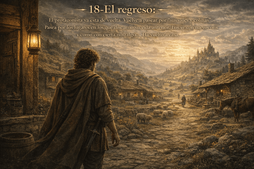 18. El Regreso. El protagonista vuelve a encontrarse con los paisajes en que había vivido y sentido insatisfacción vital. Siente una cierta nostalgia.