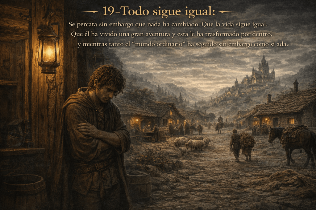 19. El Mundo Sigue Igual. Pronto se da cuenta de que todo sigue igual, pero él no es igual. El sentimiento del protagonista es el de extrañamiento o alienación.