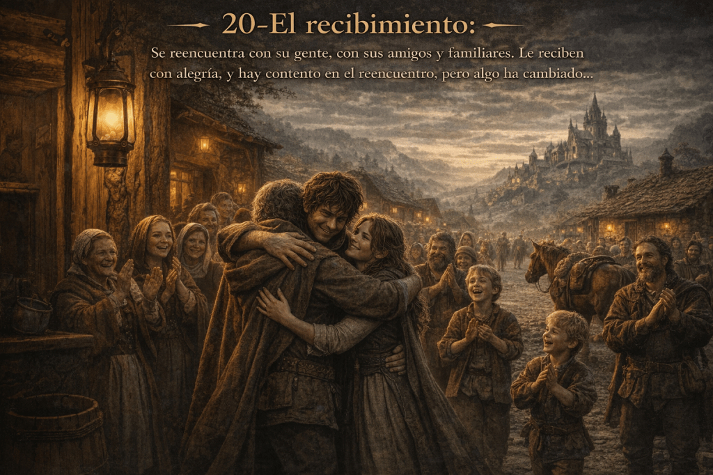 20. El Recibimiento. Se reencuentra con sus amigos y familiares, pero con esa sensación de extrañamiento respecto a ellos y a su vida que fue la suya.