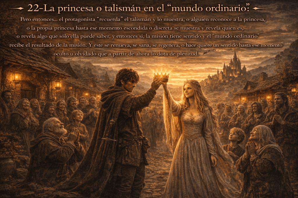 22. El Talismán se Muestra. El protagonista recuerda el talismán que trae y lo muestra. O éste se muestra por azar, o la princesa se deja y ver por la gente. Y el mundo entiende que eso es valioso para el mundo. El protagonista supera entonces su extrañamiento y se reubica. Su misión ha tenido un sentido mayor incluso de la que él vio cuando volvía de ella.