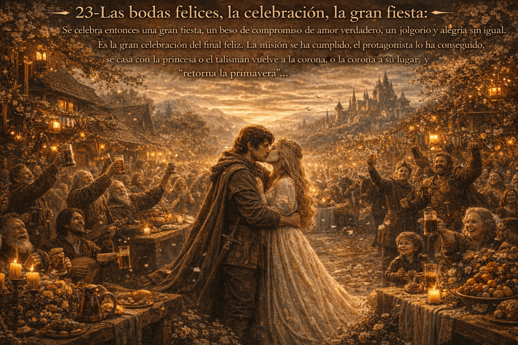 23. La Celebración. La gran fiesta. El mundo, el protagonista y el talismán se alinean. Todo se dota de plenitud y sentido, el mundo acepta y recibe el resultado de la misión. Alegría sin igual. En ese momento el protagonista se da cuenta de que lo ha logrado realmente. El mundo queda encantado, dotado de un hálito espiritual, ya no es absurdo.