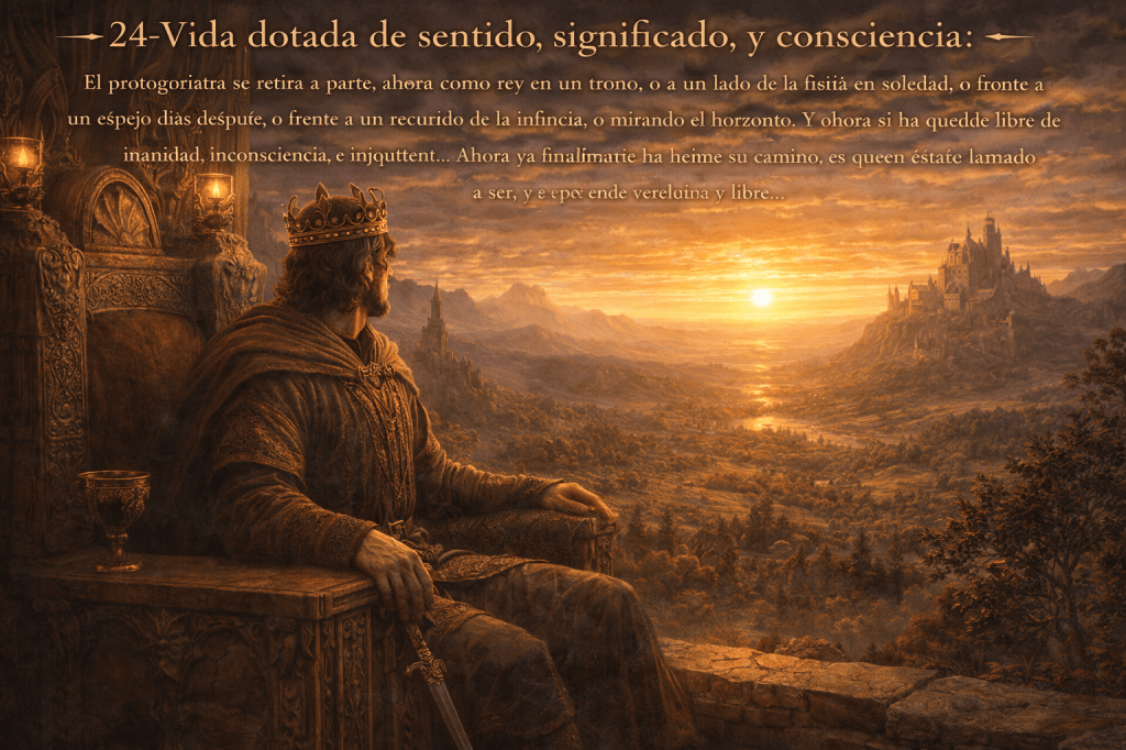 24. Vida Con Sentido, significado y consciencia. El protagonista se convierte en un sabio y puede volverse el mentor de otros. El extrañamiento ha terminado por completo y ahora es verdadero y libre. Es una persona verdaderamente adulta y madura. está sentado en el trono de la existencia.