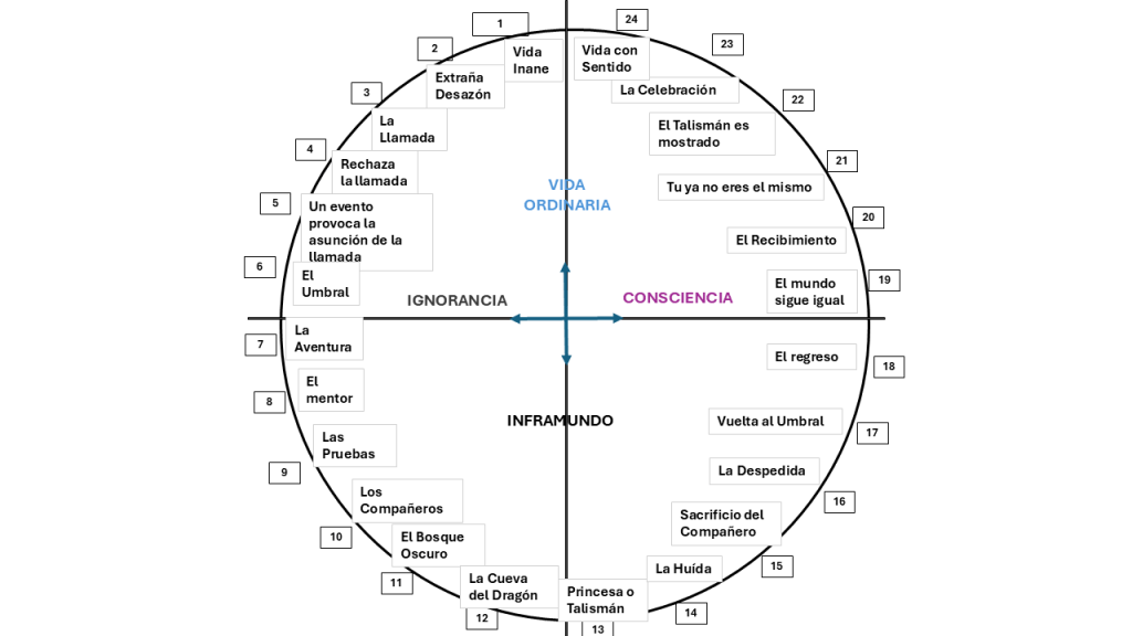 Se trata de un viaje circular en el que la mitad superior representa la vida ordinaria, la mitad inferior representa el inframundo, los dos cuadrantes de la izquierda representan la ignorancia, y los dos cuadrantes de la derecha representan la consciencia. El protagonista parte de su hogar, barrio o patria, y tras numerosas peripecias y duras pruebas vuelve a ellos transformado. Las 24 etapas se resumen en la figura, y se describen en mayor detalle a continuación. Utilizaremos para ello las bonitas diapositivas creadas por Santiago Armesilla para su video El VIAJE del HÉROE | TODAS LAS ETAPAS DEL MONOMITO, con Gonzalo RODRÍGUEZ y Santiago ARMESILLA, y la interpretación que hace Gonzalo Rodríguez de estos 24 pasos.