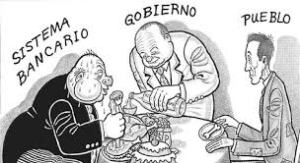 Fig. Representación satírica de la plutocracia. La figura a la izquierda representaría los mil-millonarios propietarios de grandes bancos, corporaciones y medios de comunicación; en el centro, los políticos y tecnócratas financiados por ellos; a la derecha, el 99% de la población